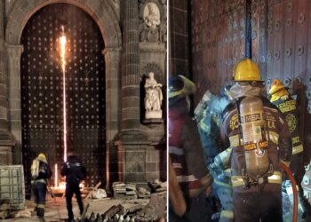 Read moreIzquierda: El incendio en una de las puertas de la Catedral de Puebla. Derecha: Los bomberos tras extinguir el fuego....