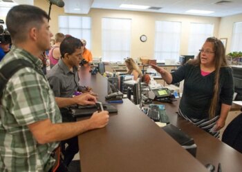Kim Davis (a la derecha) aparece en esta fotografía de 2015, cuando era secretaria del tribunal del condado de Rowan,...