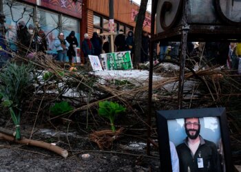 Una fotografía de Alex Pretti, de 37 años, ha sido colocada en la zona donde fue asesinado a tiros por...