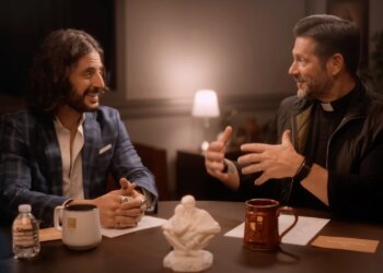 El actor Jonathan Roumie, conocido por su papel de Jesús en "The Chosen", y el P. Mike Schmitz, conocido por...