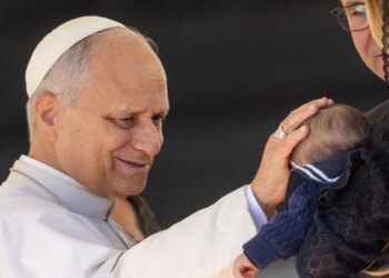 El Papa León XIV bendice un bebé en el Vaticano. / Crédito: Daniel Ibáñez / EWTN News El Papa León...