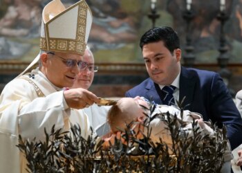El Papa León XIV bautiza a un niño en la Capilla Sixtina del Vaticano durante la festividad del Bautismo del...