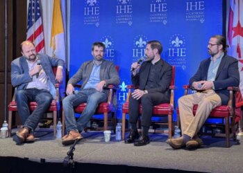 De izquierda a derecha: Ross Douthat, investigador de medios del Instituto de Ecología Humana; Will Wilson, director ejecutivo de la...
