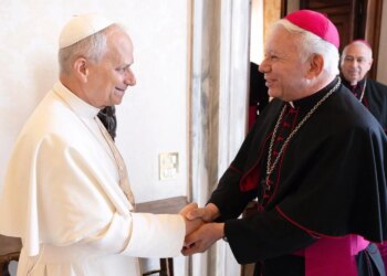 Mons. Ramón Castro Castro saluda al Papa León XIV en la audiencia que sostuvo el Santo Padre con el Consejo...