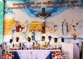 El Obispo Sebastián Tudu de Dinajpur celebra la misa en el Santuario de María Protectora el 16 de enero de...