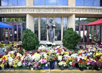 Se ven flores el 3 de septiembre de 2025, afuera de la Iglesia Católica de la Anunciación en Minneapolis, donde...