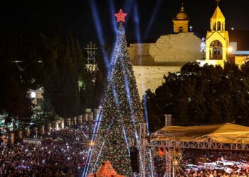 Espectadores se reúnen en la plaza de la Natividad durante la ceremonia de encendido del árbol de Navidad en Belén...