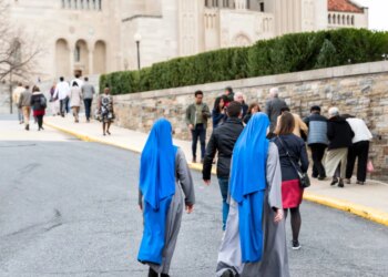Monjas caminan frente a la Basílica del Santuario Nacional de la Inmaculada Concepción en Washington, D.C., durante la Pascua de...
