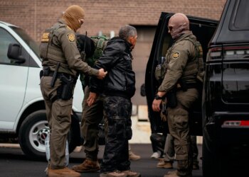 Una persona detenida es llevada a un estacionamiento en el extremo norte de Chicago antes de ser transferida a una...