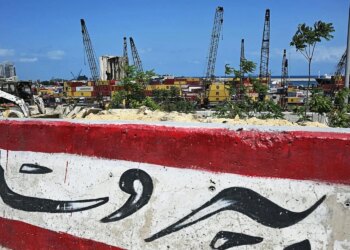 Una imagen muestra una vista de los silos destruidos del puerto de Beirut el 1 de agosto de 2025, mientras...