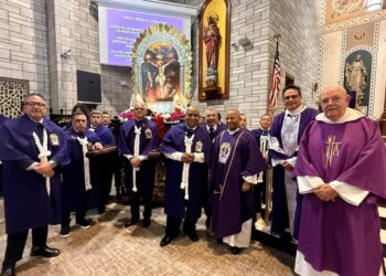 La Hermandad del Señor de los Milagros con la imagen en la iglesia Santa Juliana. / Crédito: Pastoral Hispana de...