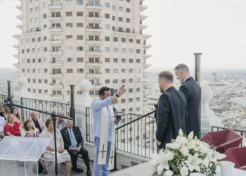 Las fotografías, difundidas en la web de los fotografos del evento, muestran una ceremonia celebrada en la azotea de un...