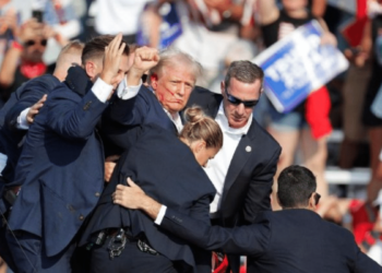 El candidato a las elecciones presidenciales en Estados Unidos por el partido Republicano, Donald Trump, levantó el puño en señal...