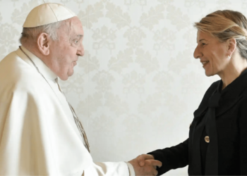 Segunda vez que se ven las caras el Papa Francisco y la vicepresidenta del Gobierno de España, Yolanda Díaz. La...