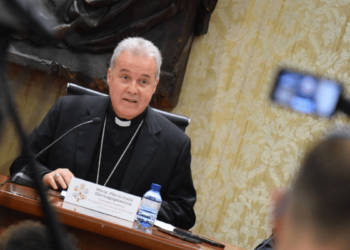 Los cardenales Grech y Hollerich, junto con el padre Costa y monseñor Battocchio, moderados por el prefecto del Dicasterio para...