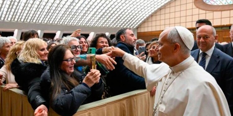 El Papa León XIV saluda a los asistentes del encuentro por el Jubileo de la Diplomacia Italiana en el Aula Pablo VI en el Vaticano. / Crédito: Vatican Media.
