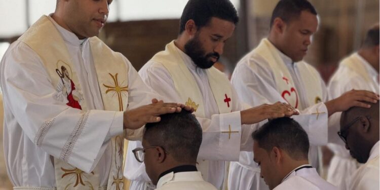 Este sábado 10 de enero fueron ordenados cinco nuevos sacerdotes para la diócesis de La Vega, en República Dominicana, una diócesis con unos 120 sacerdotes, 60 parroquias y unos 850.000 habitantes. La diócesis está en sede vacante desde hace dos meses, y presidió la ceremonia, con su imposición de manos y oración de ordenación, José Amable Durán Tineo, obispo auxiliar de Santo Domingo, que es el actual administrador apostólico de la diócesis.