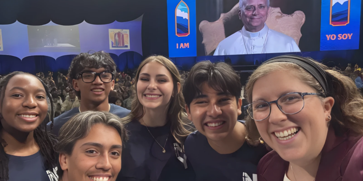 Los adolescentes Mia Smothers, Ezequiel Ponce, Micah Alcisto, Elise Wing y Chris Pantelakis, junto con la moderadora Katie McGrady, se toman una selfie con el Papa León XIV durante un encuentro digital en directo en el Lucas Oil Stadium el 21 de noviembre de 2025. / Crédito: Foto cortesía de Katie McGrady