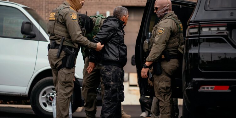 Una persona detenida es llevada a un estacionamiento en el extremo norte de Chicago antes de ser transferida a una instalación del Servicio de Inmigración y Control de Aduanas (ICE) el 31 de octubre de 2025. / Crédito: Jamie Kelter Davis/Getty Images