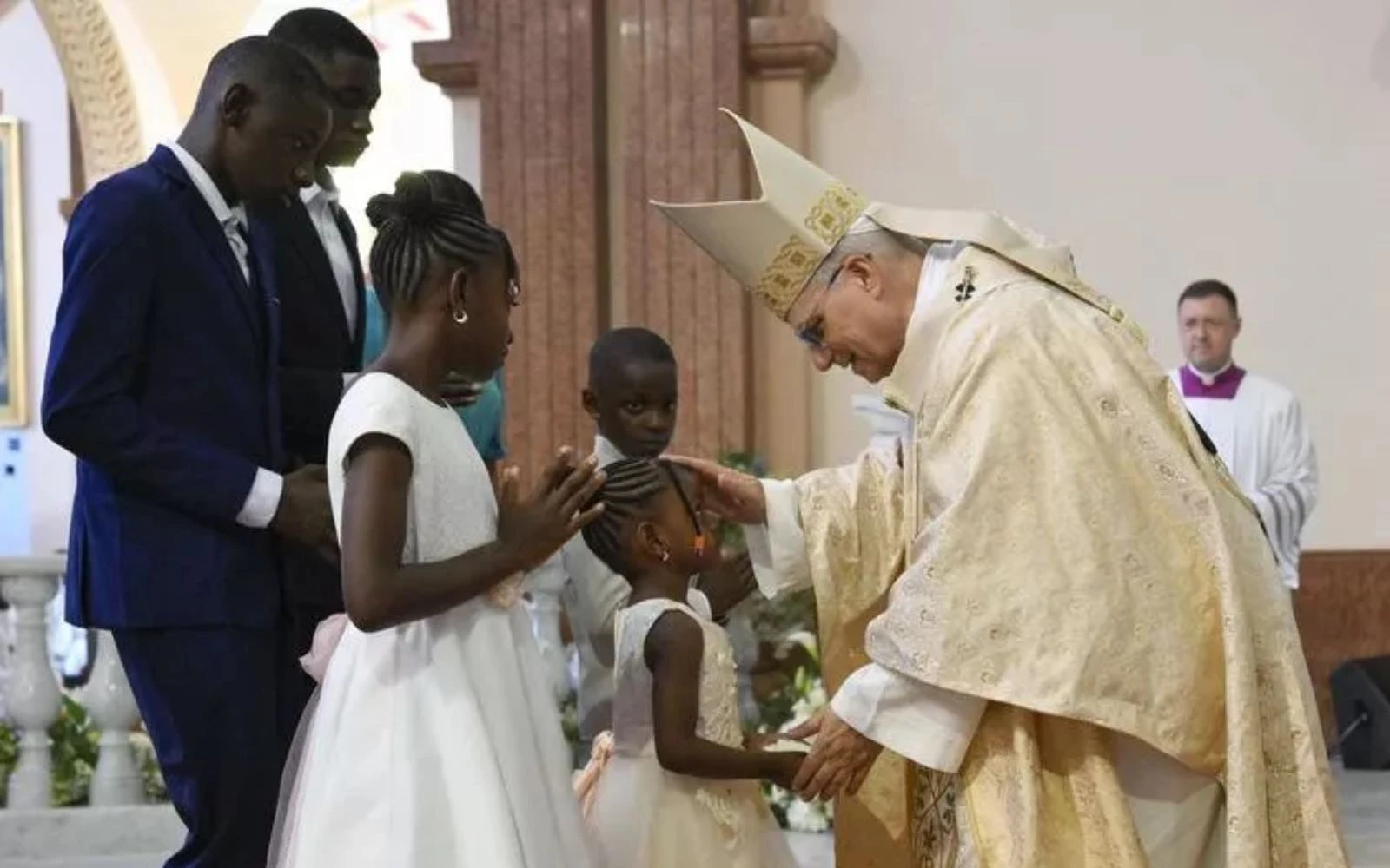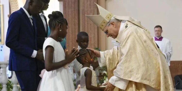 El Papa León XIV bendice a una familia durante la Santa Misa en la Basílica de la Inmaculada Concepción, en Mongomo (Guinea Ecuatorial), el 22 de abril de 2026. / Crédito: Simone Risoluti/Vatican Media.