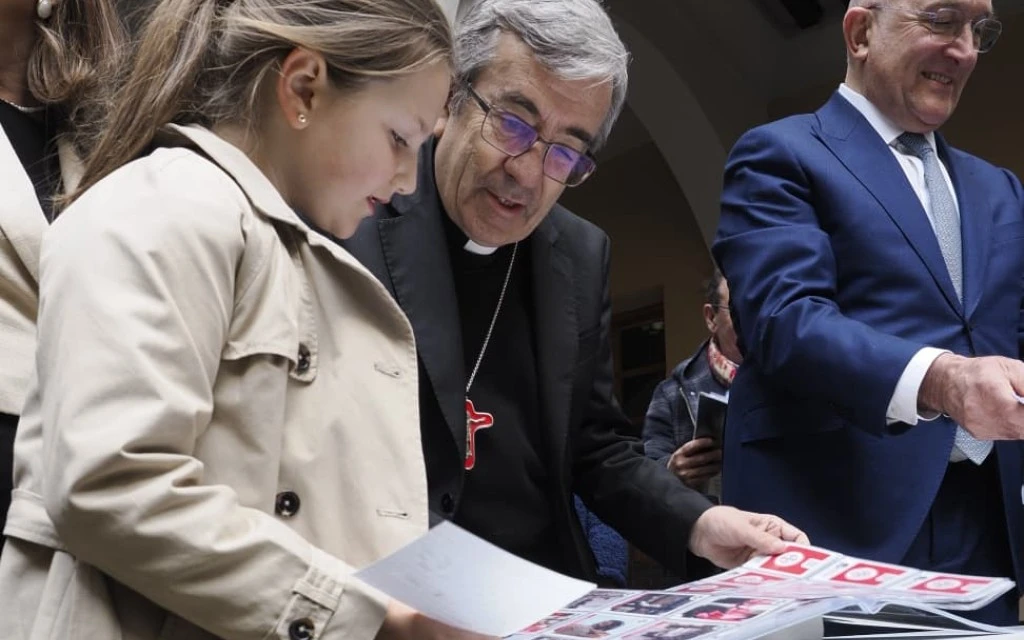 El Arzobispo de Valladolid, Mons. Luis Argüello, ayuda a una niña a completar su colección de cromos cofrades. / Crédito: Arzobispado de Valladolid.