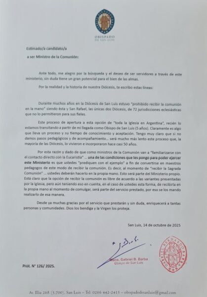 En una carta dirigida a los candidatos a ministros extraordinarios de la comunión, el obispo de San Luis, Argentina, Mons. Gabriel Bernardo Barba ha establecido una condición polémica: quienes aspiren a este servicio deberán comulgar únicamente en la mano, con el fin de “predicar con el ejemplo”.