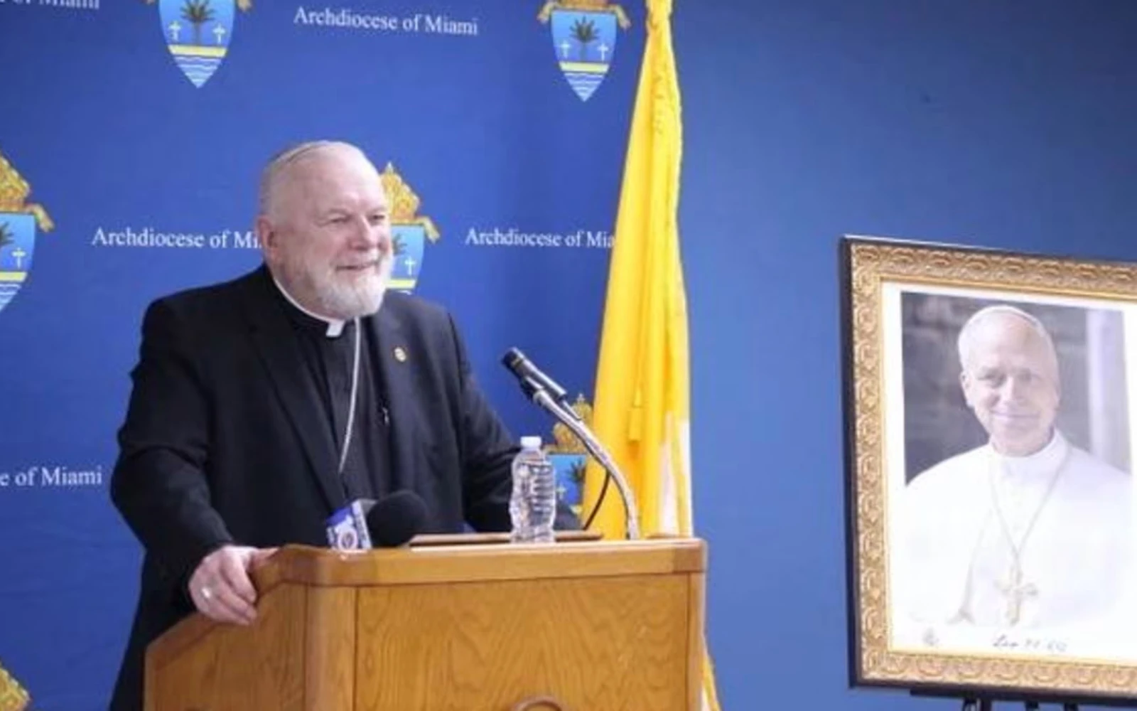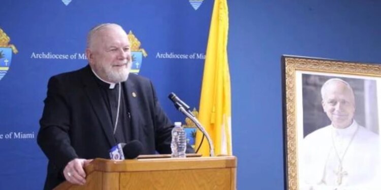 Arzobispo de Miami, Mons. Thomas Wenski, durante una conferencia de prensa el 9 de octubre de 2025 en Miami. / Crédito Emily Chaffins – EWTN News