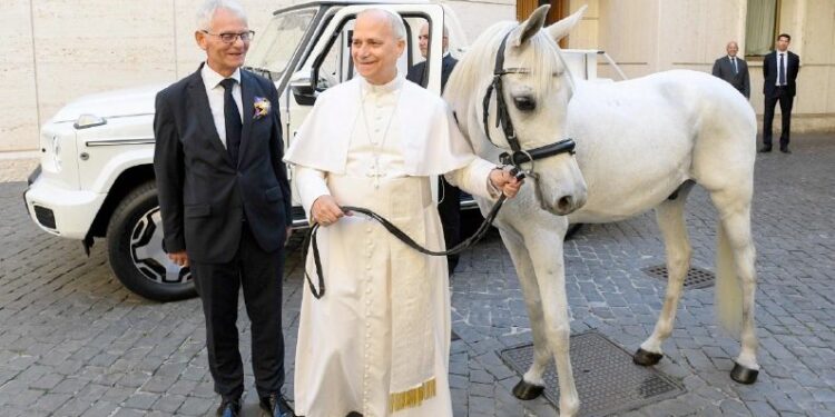 (ZENIT Noticias / Ciudad del Vaticano, 15.11.2025).- Por la mañana del miércoles 15 de octubre, el Papa León XIV recibió como regalo un caballo árabe de pura raza.