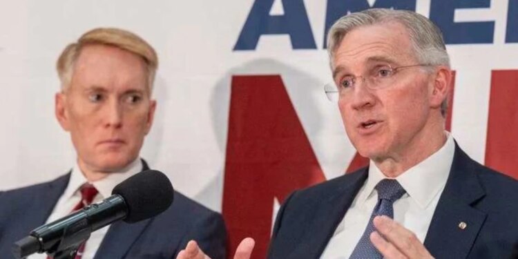El Caballero Supremo Patrick Kelly (derecha) habla en el Simposio sobre jóvenes estadounidenses, una conversación nacional sobre la restauración del propósito, el florecimiento y la pertenencia, en el National Press Club en Washington, D.C., el 3 de noviembre de 2025. El Senador James Lankford de Oklahoma lo observa. / Crédito: Matthew H. Barrick.