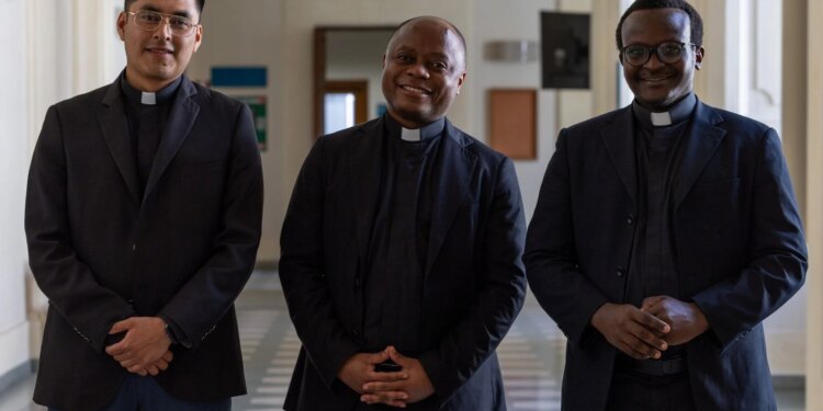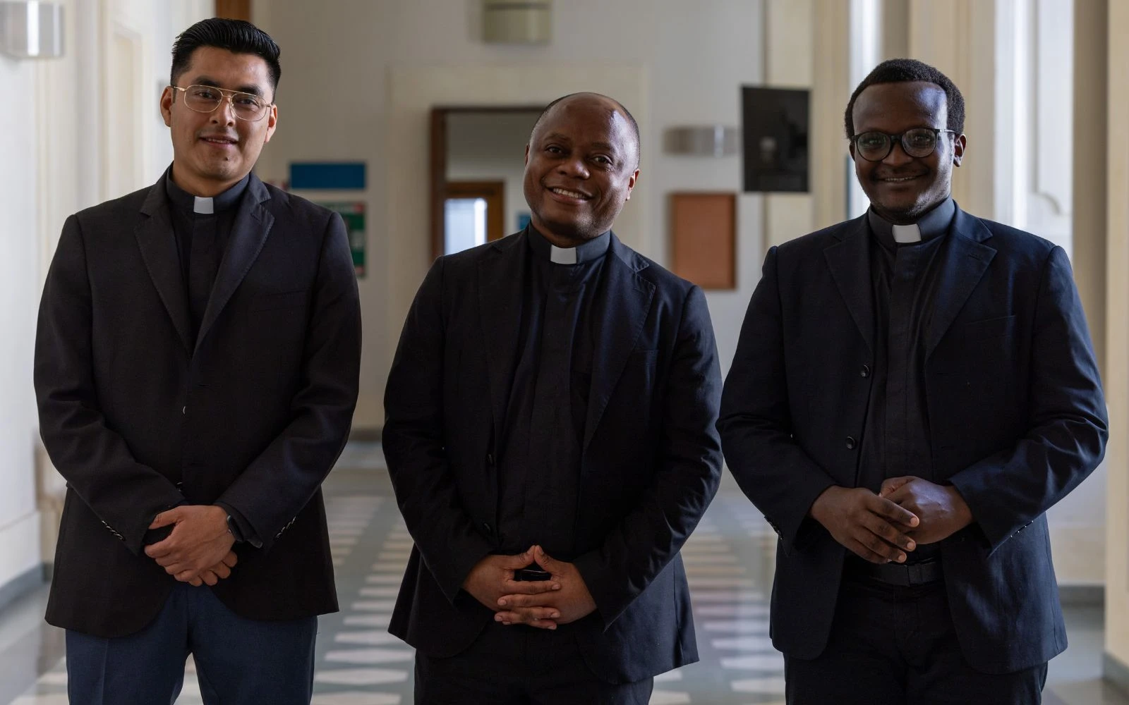 Los dos seminaristas Germán, Michael y el P. Anselme son algunos de los beneficiarios de las becas de la Universidad Pontificia de la Santa Cruz de Roma / Crédito: Daniel Ibañez/EWTN News