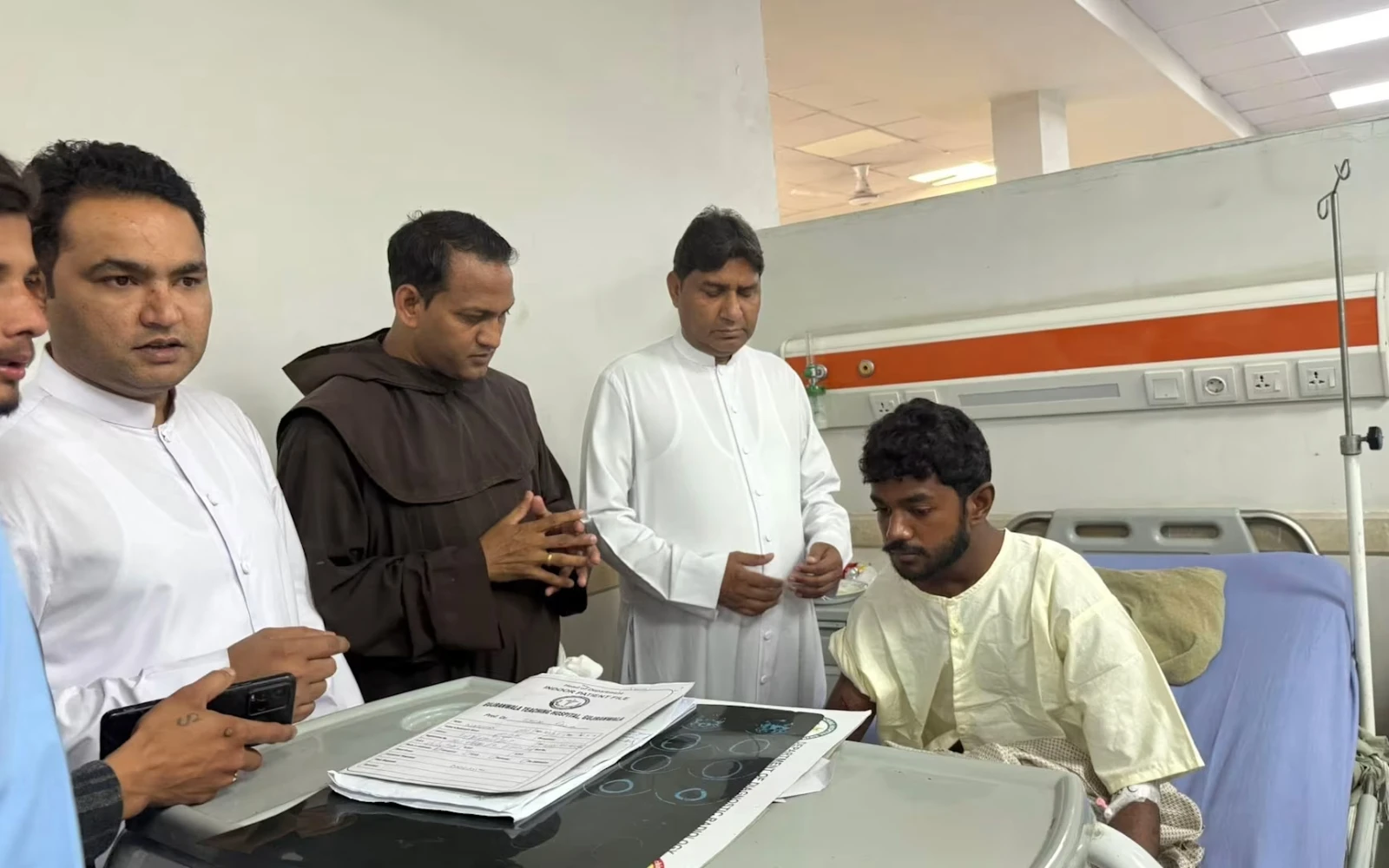 Un fraile capuchino visita a católicos heridos en un hospital de Gujranwala, provincia de Punjab, Pakistán, después de que un camión chocara contra una procesión de Pascua en Mariamabad el 5 de abril de 2026. / Crédito: Foto cortesía del padre Lazar Aslam