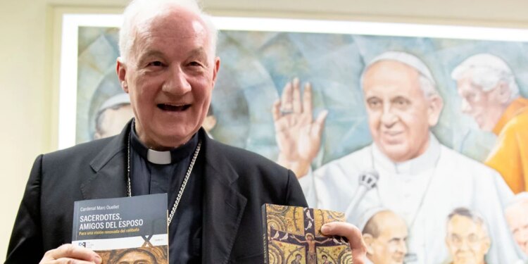 Cardenal Marc Ouellet cuando presentó su libro «Sacerdotes, amigos del Esposo» en 2019 en el Vaticano. / Crédito: Daniel Ibáñez / EWTN News.
