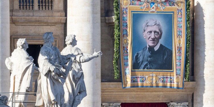 El lienzo de San John Henry Newman en la fachada de la Basílica de San Pedro, el 1 de noviembre, cuando el Papa León XIV lo declaró Doctor de la Iglesia. / Crédito: Daniel Ibáñez / EWTN News.