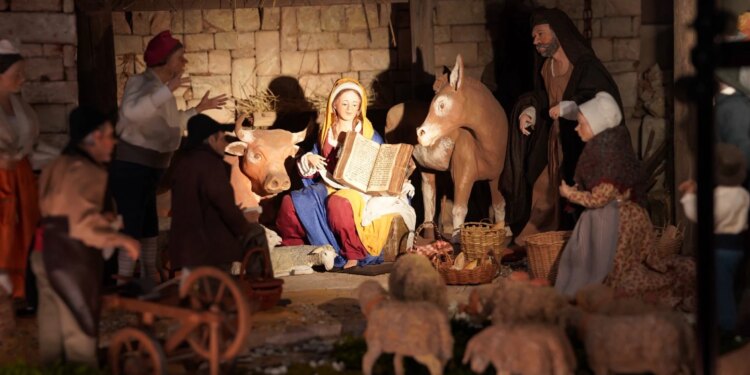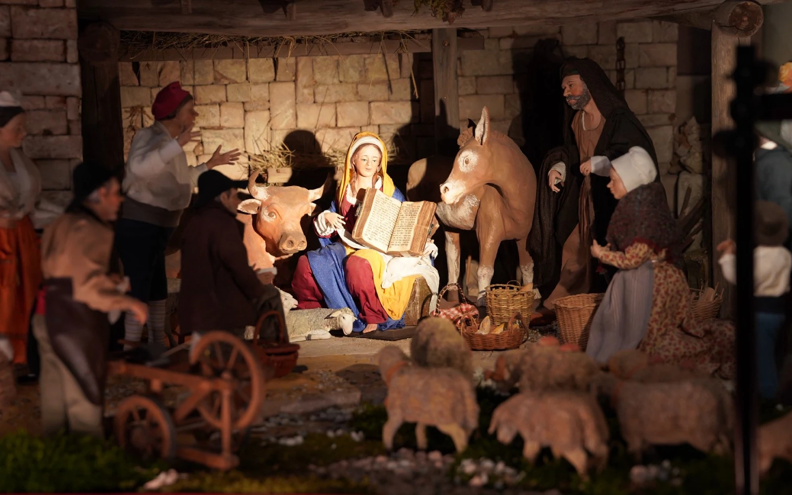El belén reúne más de 50 “santons”, las tradicionales figuras artesanales de la Provenza francesa. Estas representaciones incluyen pastores, campesinos, familias y distintos oficios populares que acuden al Niño Jesús, quien aparece acompañado por la Virgen María y San José.