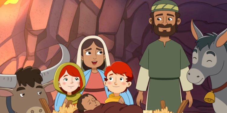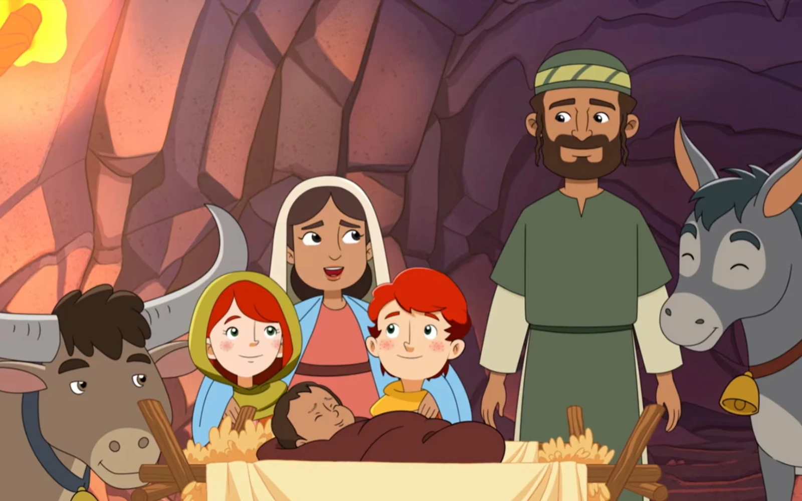Patrick y Katie conocen a la Sagrada Familia en un episodio de “Chime Travelers”. / Crédito: Family Theater Productions