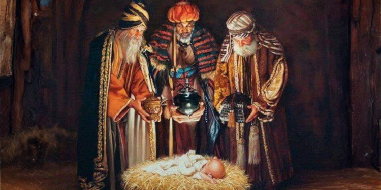 Los tres Magos llegan en silencio y, presas de inefable estupor, se prosternan. La estrella se retira despacito al ver a María, que sostiene al Niño como una custodia eucarística. José, a un lado, guarda el misterio con elegante y vigoroso recato…