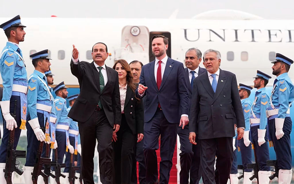 El vicepresidente de Estados Unidos, JD Vance, camina junto al jefe de las Fuerzas de Defensa y jefe del Estado Mayor del Ejército de Pakistán, el mariscal de campo Asim Munir (I), y el viceprimer ministro y ministro de Asuntos Exteriores pakistaní, Mohammad Ishaq Dar, tras su llegada a Islamabad para reunirse con funcionarios iraníes el 11 de abril de 2026. / Crédito: Jacquelyn Martin /POOL/AFP vía Getty Images
