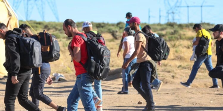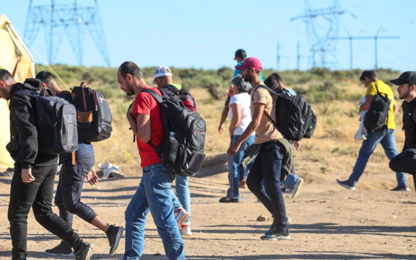 Los migrantes y solicitantes de asilo regresan a sus tiendas en un campamento improvisado después de que agentes de la Patrulla Fronteriza les negaran el acceso y recogieran únicamente a mujeres, niños y familias. Al resto de los hombres se los llevaron en transbordadores menos de una hora después. / Crédito: Robert Gauthier/Los Angeles Times vía Getty Images.