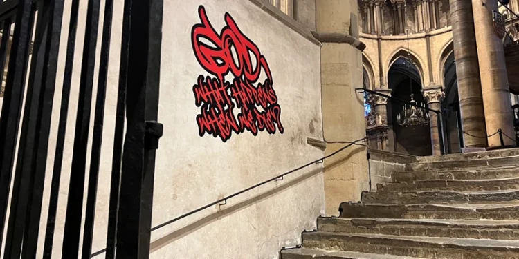Redacción (13/10/2025 10:55, Gaudium Press) Es la propia página web de la Catedral de Canterbury, la que publica desvergonzadamente el estampado de grafitis en la centenaria catedral, con la complacencia de sus autoridades.