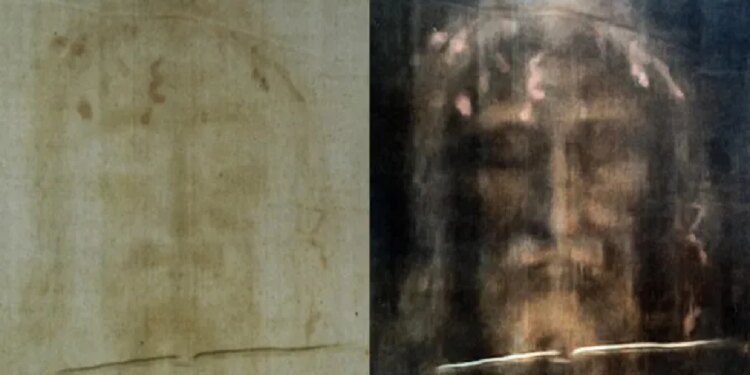 La Sábana Santa de Turín con filtros digitales positivos (izquierda) y negativos (derecha). / Crédito: Dianelos Georgoudis vía Wikimedia Commons