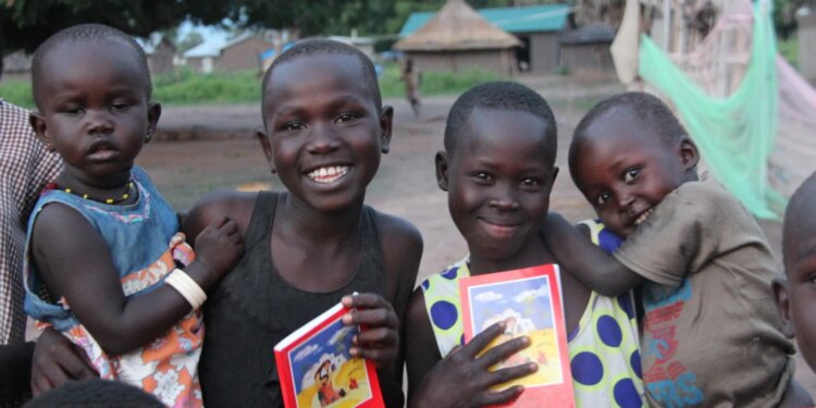 Niños de la diócesis de Torin (Sudán del Sur) reciben los ejemplares de «La Biblia del Niño». / Crédito: ACN.