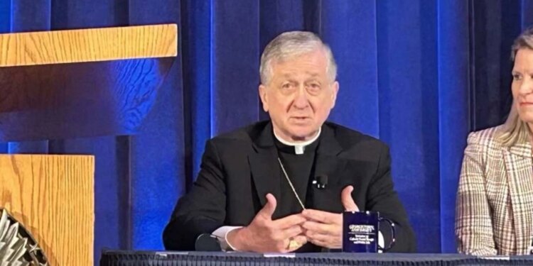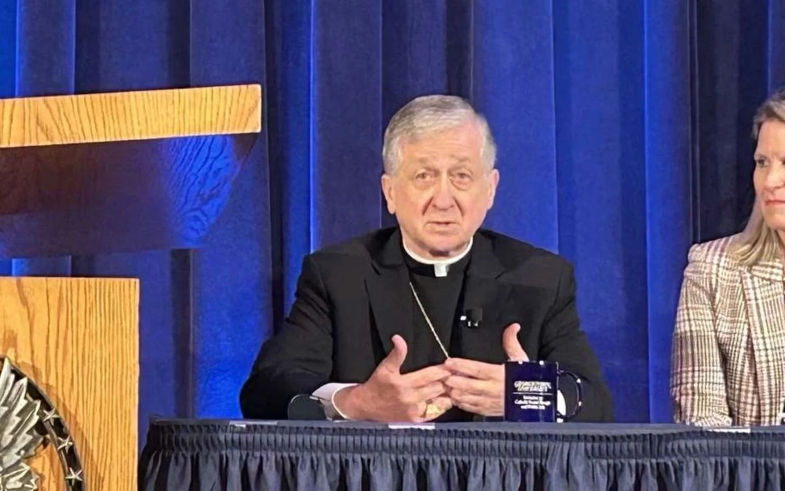 El Cardenal Blase Cupich de Chicago, quien publicó un mensaje en video en nombre de la Conferencia de Obispos Católicos de Estados Unidos (USCCB) sobre el Mes de la Prevención del Abuso Infantil, ofrece declaraciones en un foro de la Universidad de Georgetown el 30 de octubre de 2025. / Crédito: Madalaine Elhabbal/EWTN News.