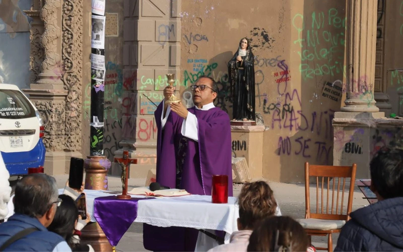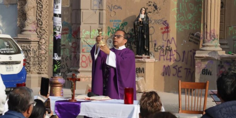 El 9 de marzo, el P. Jorge Aurelio Ramírez Torres celebró la Misa frente a la parroquia de La Compañía, pidiéndole “a Jesús perdón por todos estos hechos ocurridos el día de ayer que son una profanación a este recinto sagrado”. / Crédito: Lupita Gutiérrez.