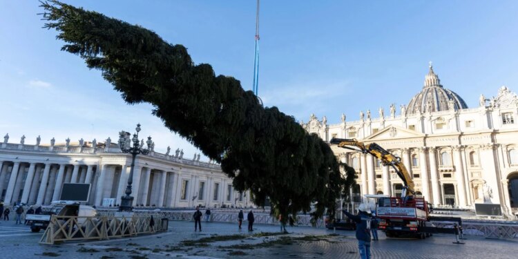 Un imponente árbol de Navidad se alza en el centro de la Plaza de San Pedro, después de que el abeto llegara al Vaticano en la mañana de este jueves 27 de noviembre.