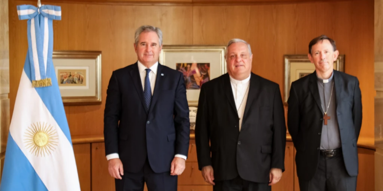 El encuentro se desarrolló en la sede del Ministerio de Relaciones Exteriores, Comercio internacional y Culto y contó con la presencia del presidente de la Conferencia Episcopal Argentina, Mons. Marcelo Colombo; su secretario general, Mons. Raúl Pizarro; el P. Máximo Jurcinovic, responsable de la Oficina de Comunicación y Prensa del Episcopado; el canciller Pablo Quirno y el subsecretario de Culto, Agustín Caulo.
