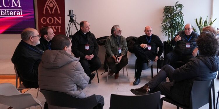 Más de mil sacerdotes que trabajan en la diócesis de Madrid se reúnen este lunes y martes en la gran asamblea de sacerdotes Convivium en el Auditorio Pablo VI (Paseo Juan XXIII, 3, Madrid). Los periodistas Raquel Caldas e Israel Remuiñán presentaron el encuentro. En la primera parte se cantó el himno compuesto para esta cita (llamado Ungidos) interpretado en directo por sus creadores, los sacerdotes Luispo e Ignacio Ozores, junto a decenas de sacerdotes.