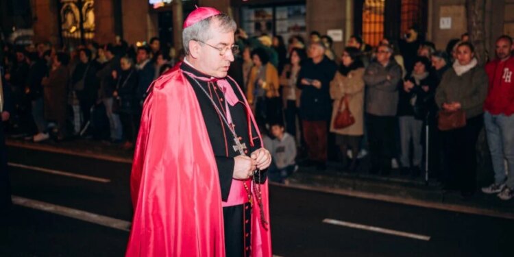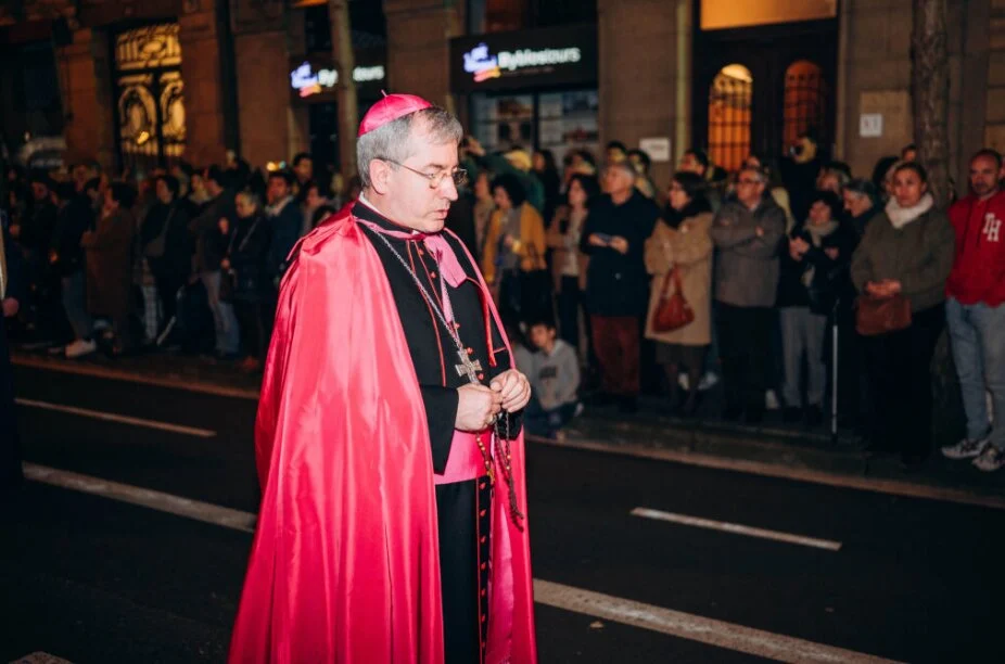 Y aunque en la organización de la procesión, el obispo no ha tomado ningún protagonismo porque la iniciativa ha sido impulsada por un grupo de laicos, Fernando Prado acompañó el cortejo procesional y leyó unas palabras antes de que diera comienzo, justo al final de la celebración de los oficios del Viernes Santo en la catedral.