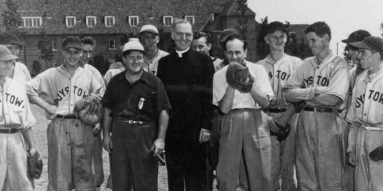 P. Edward Flanagan con jugadores de béisbol en Boys Town / Crédito: Foto cortesía de la Liga Padre Flanagan