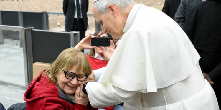 El Papa muestra su cariño a un mujer en el Aula Pablo VI del Vaticano / Crédito: Vatican Media