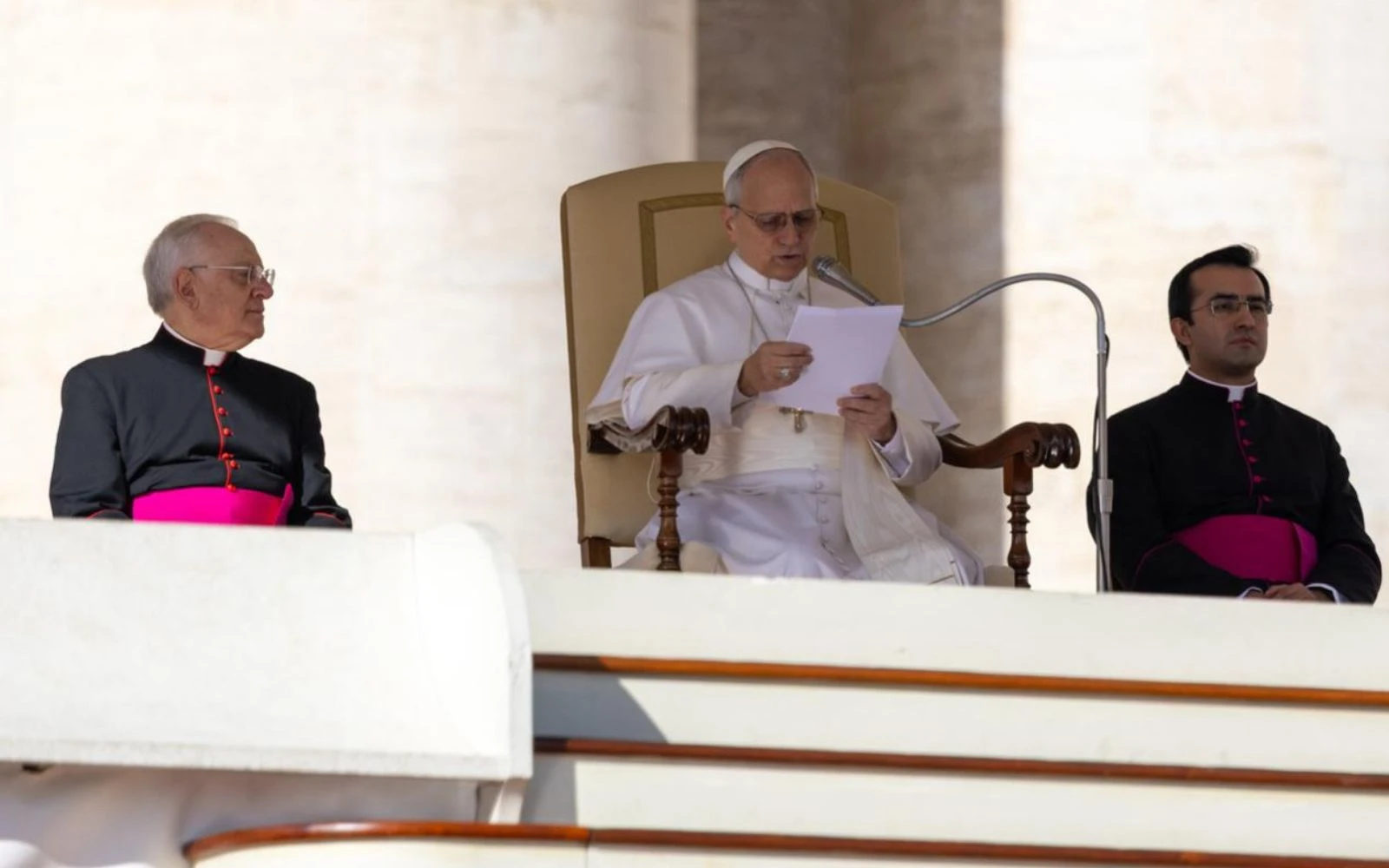 El Papa durante la Audiencia General, junto a su secretario personal, el sacerdote peruano Edgard Iván Rimaycuna Inga, y el regente de la Prefectura de la Casa Pontificia, Mons. Leonardo Sapienza / Crédito: Daniel Ibañez/ EWTN News